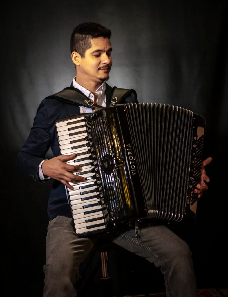 Douglas Marcolino porte en lui l’âme du Nordeste brésilien. Initié à l’accordéon dès son plus jeune âge par son père, Tiao Marcolino, il enregistre son premier album à huit ans et forge son art au contact des plus grands : Dominguinhos, Hermeto Pascoal, Gennaro do Acordeon. Son parcours le mène aux quatre coins du Brésil, puis bien au-delà. En 2010, une tournée internationale l’amène à Paris, une ville qui l’envoûte et où il choisit de poser ses valises en 2011. Aujourd’hui, il sillonne les scènes du monde entier, portant haut les couleurs du forró et explorant de nouvelles sonorités, toujours guidé par sa passion et sa virtuosité.